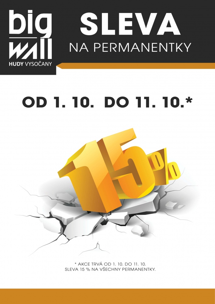 Pokud uvažujete o nákupu permanentky na stěnu nebo boulder, máme pro vás dobrou zprávu. Od 1.10. do 11.10. si můžete jakoukoli permanentku koupit se slevou 15 %. Samozřejmě stále platí, že s permanentkou jsou u nás nákupy lezeckého zboží levnější o 10 %.