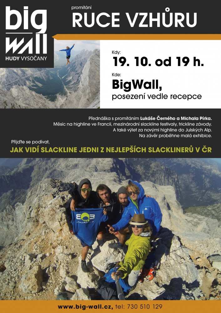 Jedná se o přednášku s promítáním Lukáše Černého a Michala Pírka, jejíž náplní budou mezinárodní slackline a trickline závody, měsíc na highline ve Francii a následný výlet za úplně novými highline do Julských Alp.